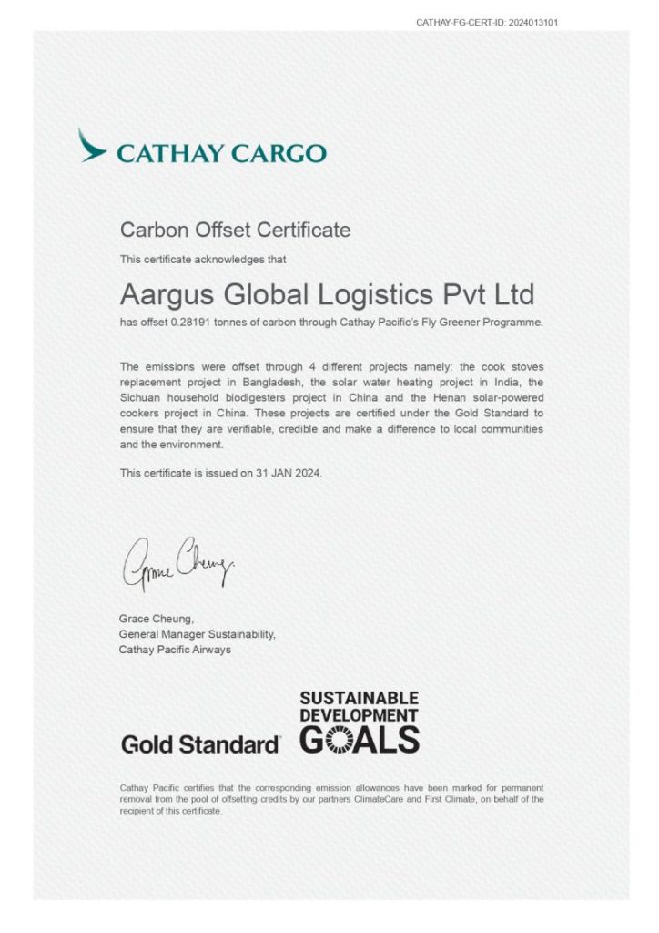Cathay Cargo presented Carbon Offset Certificate to Aargus Global Logistics